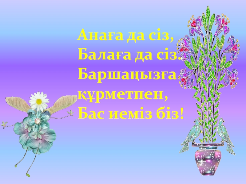 Анаға да сіз,Балаға да сіз.Баршаңызға құрметпен,Бас иеміз біз!