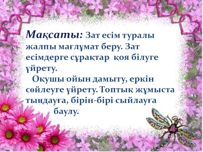 Мақсаты: Зат есім туралы жалпы мағлұмат беру. Зат есімдерге сұрақтар