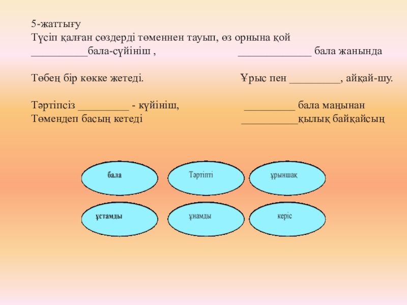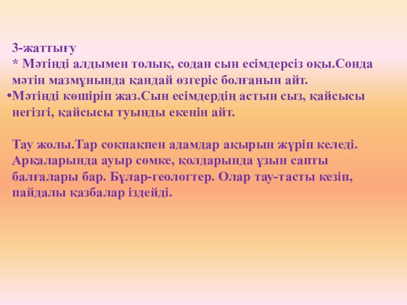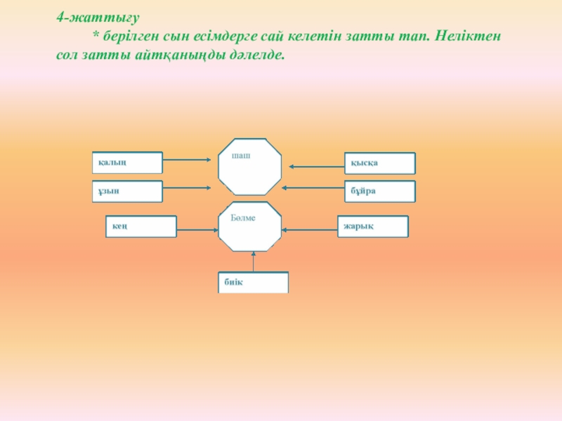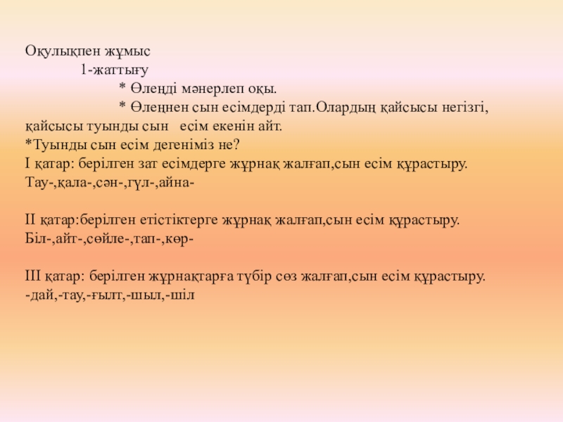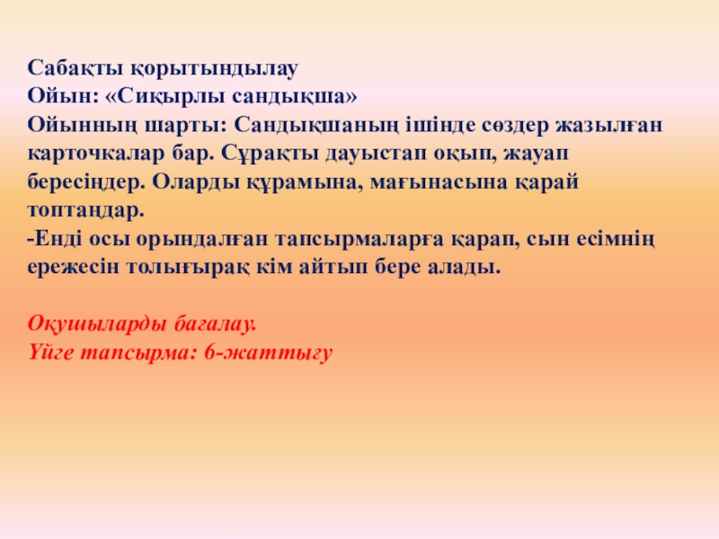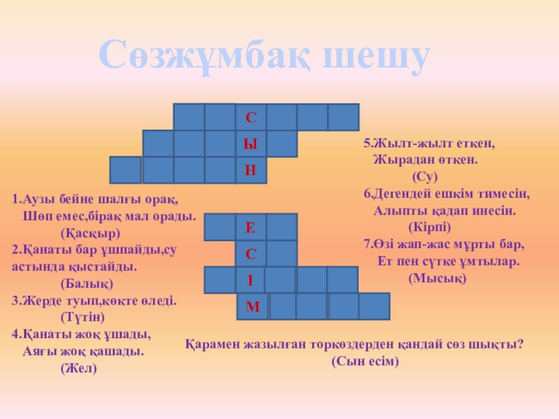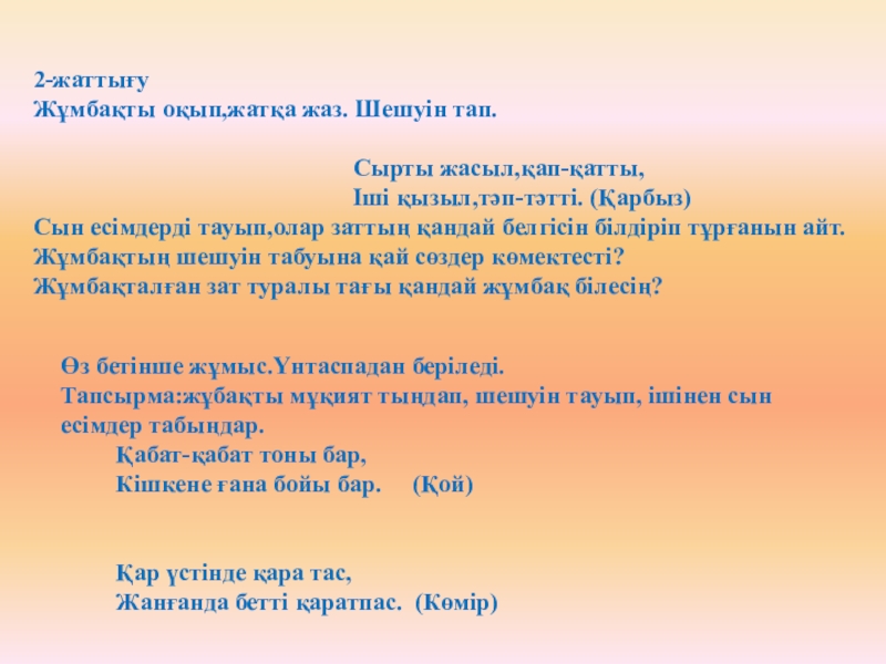 Тапсырма:жұбақты мұқият тыңдап, шешуін тауып, ішінен сын есімдер табыңдар.