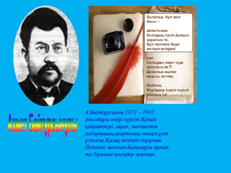 А.Байтұрсынов 1872 – 1937 жылдары өмір сүрген.Қоғам қайраткері, ақын, лингвистік аудармашы,ағартушы ғалым,ұлт ұстазы.Қазақ тілінде тұңғыш Әліппені жазған.Балаларға арнап та бірнеше өлеңдер жазған.