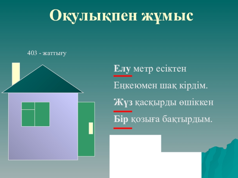 Оқулықпен жұмысЕлу метр есіктенЕңкеюмен шақ кірдім.Жүз қасқырды өшіккенБір қозыға бақтырдым.403 - жаттығу