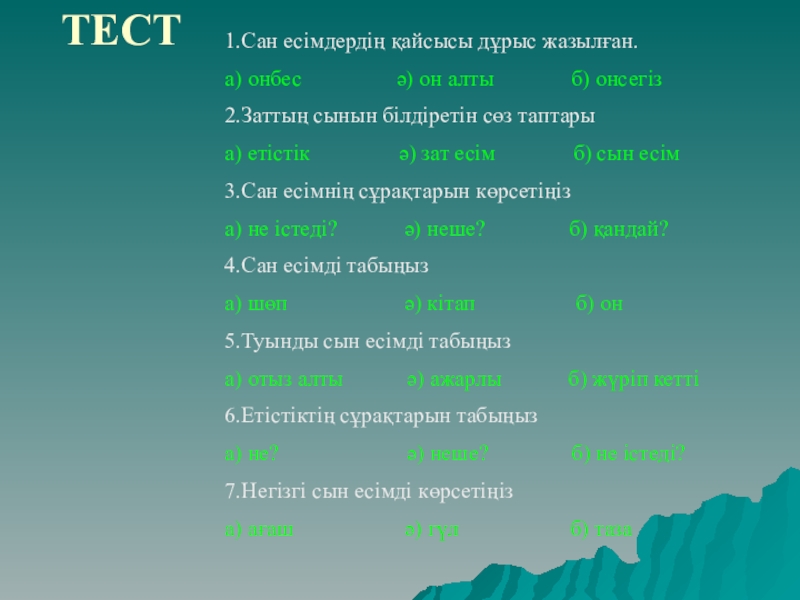 ТЕСТ1.Сан есімдердің қайсысы дұрыс жазылған.а) онбес         ә) он алты