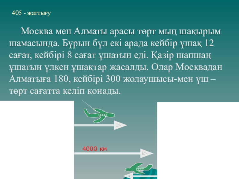 405 - жаттығу4000 км	Москва мен Алматы арасы төрт мың шақырым шамасында. Бұрын бұл екі арада кейбір ұшақ