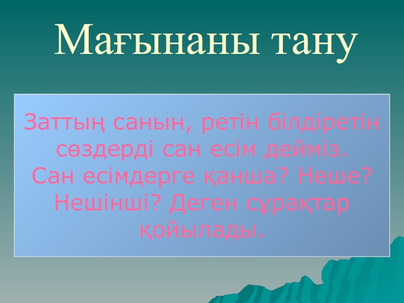 Мағынаны тануЗаттың санын, ретін білдіретін сөздерді сан есім дейміз. Сан есімдерге қанша? Неше? Нешінші? Деген сұрақтар қойылады.