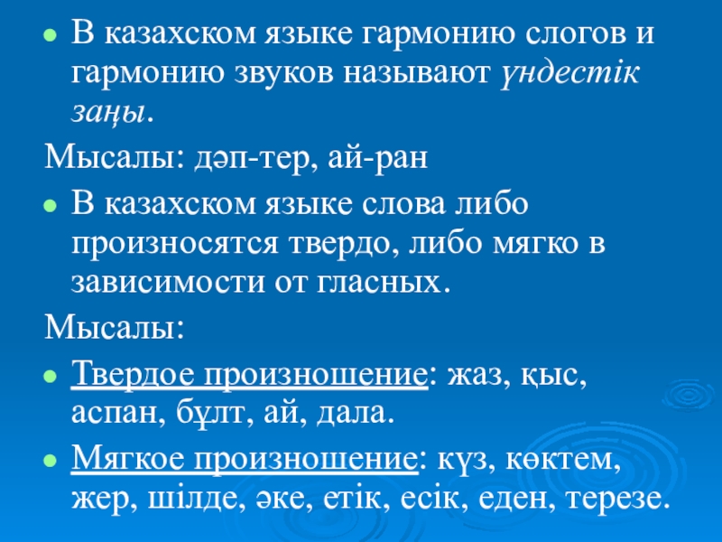 В казахском языке гармонию слогов и гармонию звуков называют үндестік заңы.Мысалы: дәп-тер, ай-ранВ казахском языке слова либо произносятся твердо, либо мягко в зависимости от гласных. Мысалы: Твердое произношение: жаз, қыс, аспан, бұлт, ай, дала.Мягкое произношение: күз,