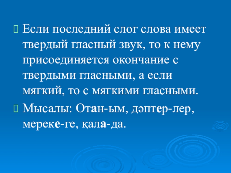 Если последний слог слова имеет твердый гласный звук, то к нему присоединяется окончание с твердыми гласными, а