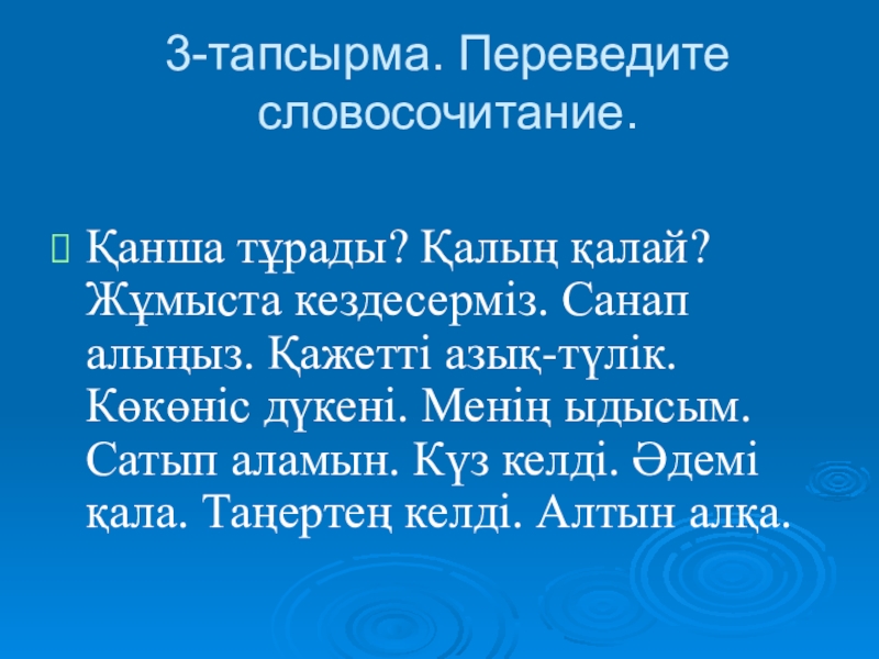 3-тапсырма. Переведите словосочитание. Қанша тұрады? Қалың қалай? Жұмыста кездесерміз. Санап алыңыз. Қажетті азық-түлік. Көкөніс дүкені. Менің ыдысым.