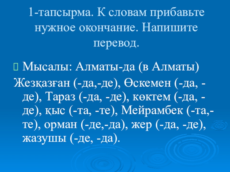 1-тапсырма. К словам прибавьте нужное окончание. Напишите перевод. Мысалы: Алматы-да (в Алматы)Жезқазған (-да,-де), Өскемен (-да, -де), Тараз