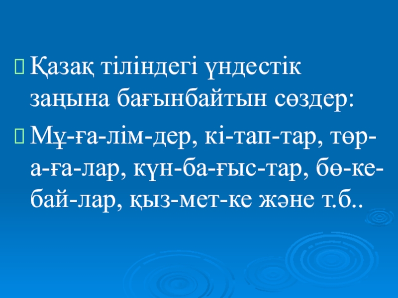 Қазақ тіліндегі үндестік заңына бағынбайтын сөздер:Мұ-ға-лім-дер, кі-тап-тар, төр-а-ға-лар, күн-ба-ғыс-тар, бө-ке-бай-лар, қыз-мет-ке және т.б..
