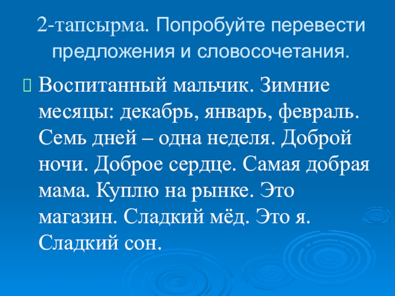2-тапсырма. Попробуйте перевести предложения и словосочетания. Воспитанный мальчик. Зимние месяцы: декабрь, январь, февраль. Семь дней – одна