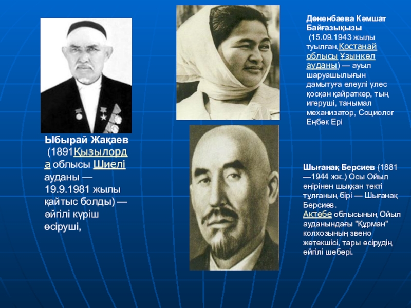 Ақтөбе облысының Ойыл ауданындағы "Құрман" колхозының звено жетекшісі, тары өсірудің әйгілі шебері.