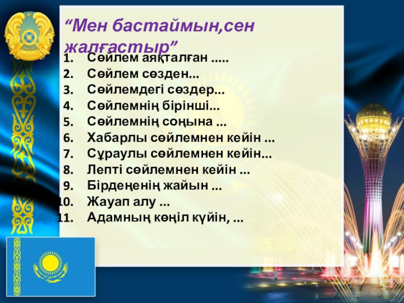 “Мен бастаймын,сен жалғастыр”Сөйлем аяқталған .....Сөйлем сөзден...Сөйлемдегі сөздер...Сөйлемнің бірінші...Сөйлемнің соңына ...Хабарлы сөйлемнен кейін ...Сұраулы сөйлемнен кейін...Лепті сөйлемнен кейін