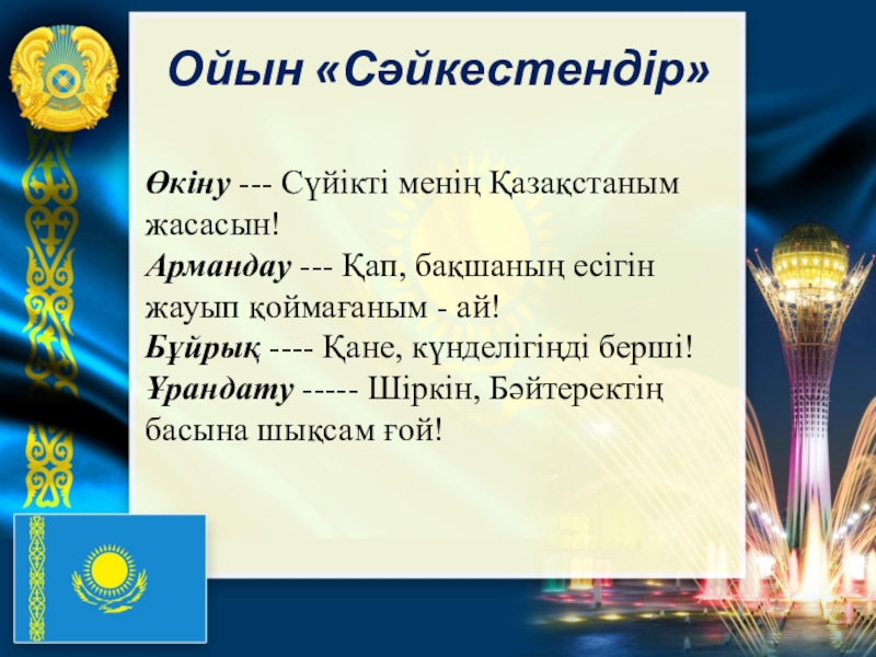 жауып қоймағаным - ай! Бұйрық ---- Қане, күнделігіңді берші! Ұрандату ----- Шіркін, Бәйтеректің басына шықсам ғой!
