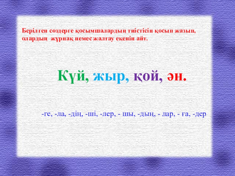 -ге, -ла, -дің, -ші, -лер, - шы, -дың, - лар, - ға, -дер