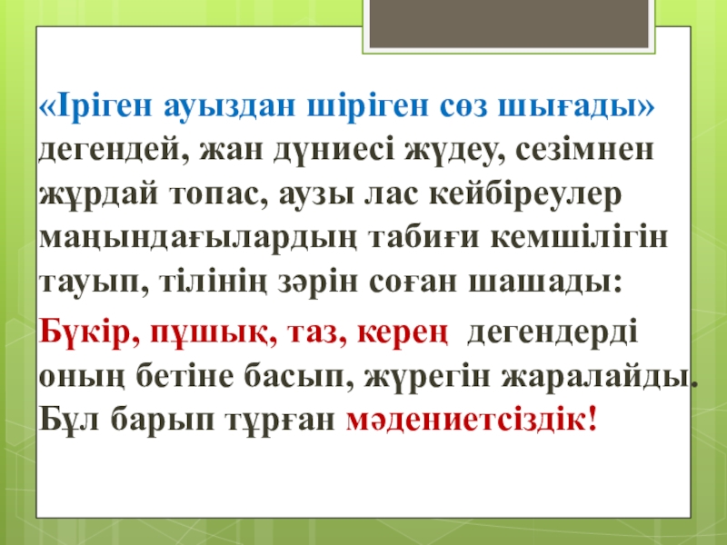 Слайд 9«Іріген ауыздан шіріген сөз шығады» дегендей, жан дүниесі жүдеу, сезімнен жұрдай
