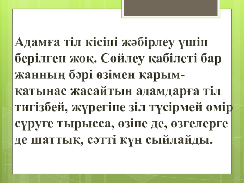 Слайд 10Адамға тіл кісіні жәбірлеу үшін берілген жоқ. Сөйлеу қабілеті бар жанның