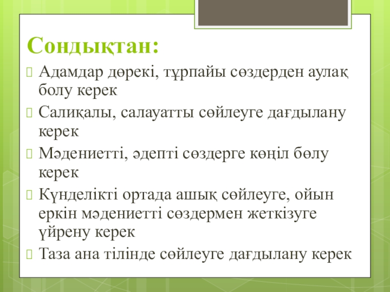 Сондықтан:Адамдар дөрекі, тұрпайы сөздерден аулақ болу керекСалиқалы, салауатты сөйлеуге дағдылану керекМәдениетті, әдепті сөздерге көңіл бөлу керекКүнделікті ортада
