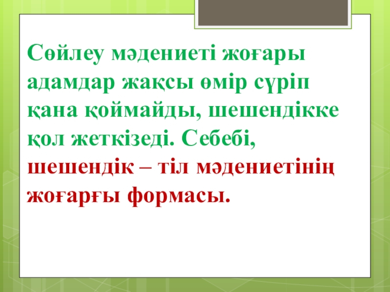 Слайд 12Сөйлеу мәдениеті жоғары адамдар жақсы өмір сүріп қана қоймайды, шешендікке қол