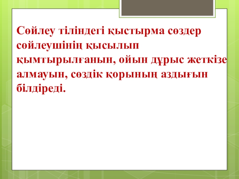 Слайд 8Сөйлеу тіліндегі қыстырма сөздер сөйлеушінің қысылып қымтырылғанын, ойын дұрыс жеткізе алмауын,