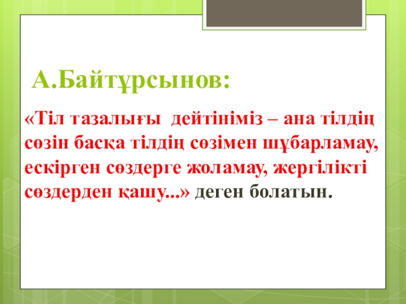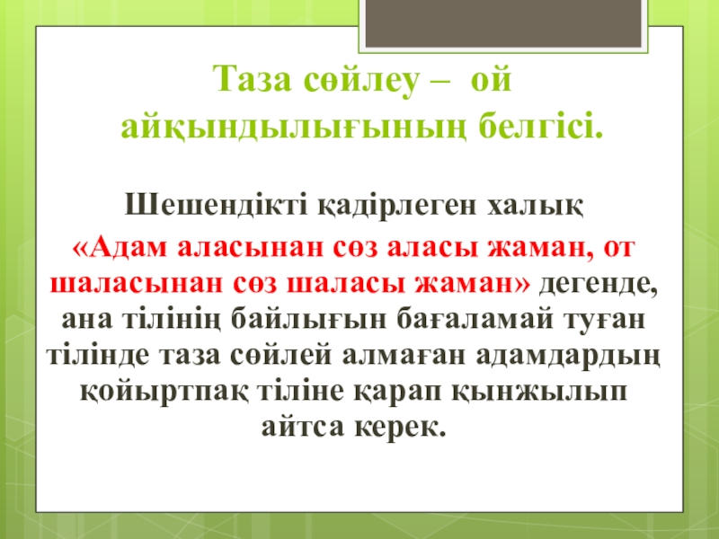 Слайд 4«Таза сөйлеу дегеніміз сол тілдің жалпыға ортақ байлықтарын пайдаланып, «бөгде» сөздерді