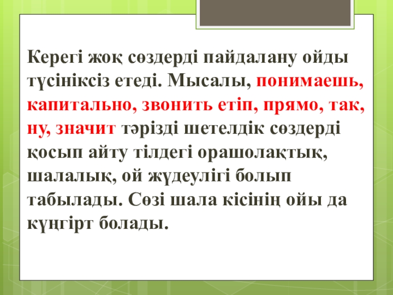 Слайд 6Керегі жоқ сөздерді пайдалану ойды түсініксіз етеді. Мысалы, понимаешь, капитально, звонить
