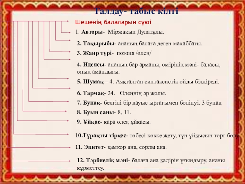 12. Тәрбиелік мәні- балаға ана қадірін ұғындыру, ананы құрметтеу.