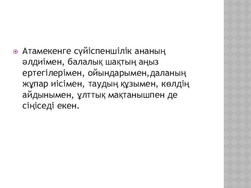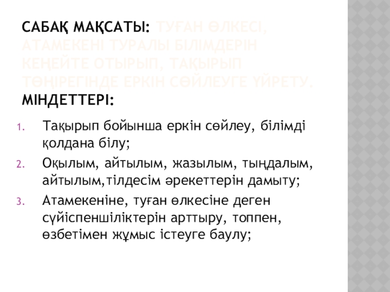 Атамекеніне, туған өлкесіне деген сүйіспеншіліктерін арттыру, топпен, өзбетімен жұмыс істеуге баулу;