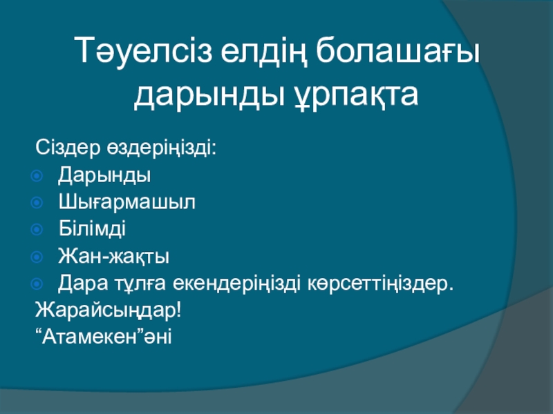 Тәуелсіз елдің болашағы дарынды ұрпақтаСіздер өздеріңізді:ДарындыШығармашылБілімдіЖан-жақты Дара тұлға екендеріңізді көрсеттіңіздер.Жарайсыңдар!“Атамекен”әні
