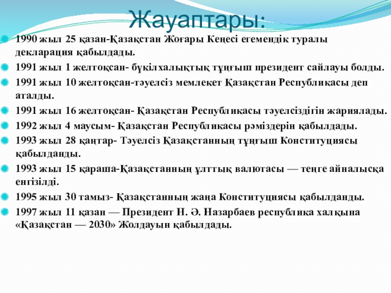 Жауаптары:1990 жыл 25 қазан-Қазақстан Жоғары Кеңесі егемендік туралы декларация қабылдады.1991 жыл 1 желтоқсан- бүкілхалықтық тұңғыш президент сайлауы болды.1991 жыл 10 желтоқсан-тәуелсіз мемлекет Қазақстан Республикасы деп аталды.1991 жыл 16 желтоқсан- Қазақстан Республикасы тәуелсіздігін жариялады.1992 жыл 4 маусым-