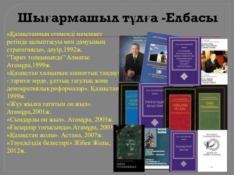 Шығармашыл тұлға -Елбасы«Қазақстанның егеменді мемлекет ретінде қалыптасуы мен дамуының стратегиясы», дәуір,1992ж.“Тарих толқынында” Алматы: Атамұра,1999ж.«Қазақстан халқының азаматтық таңдауы