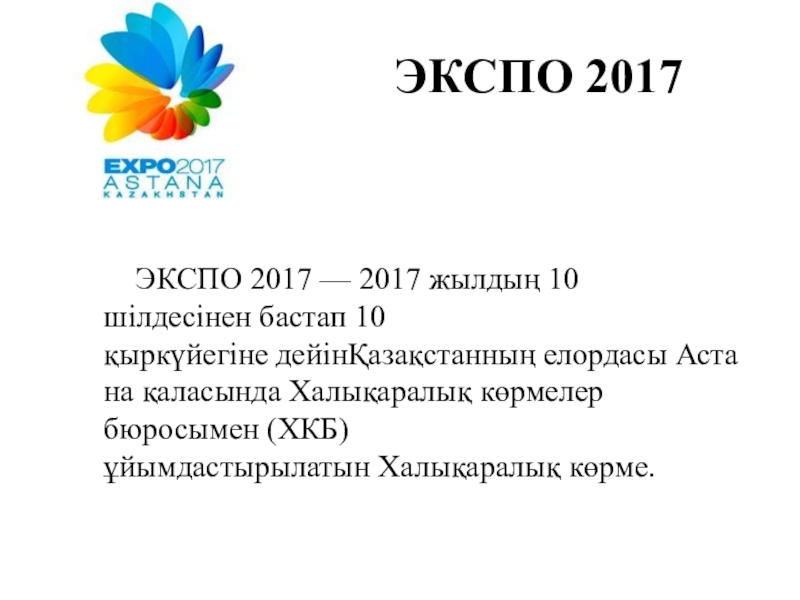 ЭКСПО 2017 — 2017 жылдың 10 шілдесінен бастап 10 қыркүйегіне дейінҚазақстанның елордасы Астана қаласында Халықаралық көрмелер