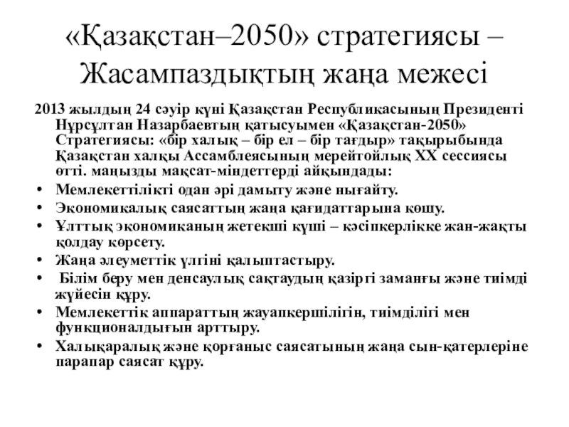 Слайд 9«Қазақстан–2050» стратегиясы – Жасампаздықтың жаңа межесі