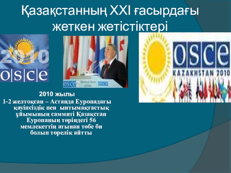 Қазақстанның ХХІ ғасырдағы жеткен жетістіктері2010 жылы1-2 желтоқсан – Астанда Еуропадағы қауіпсіздік пен  ынтымақтастық ұйымының саммиті Қазақстан Еуропаның