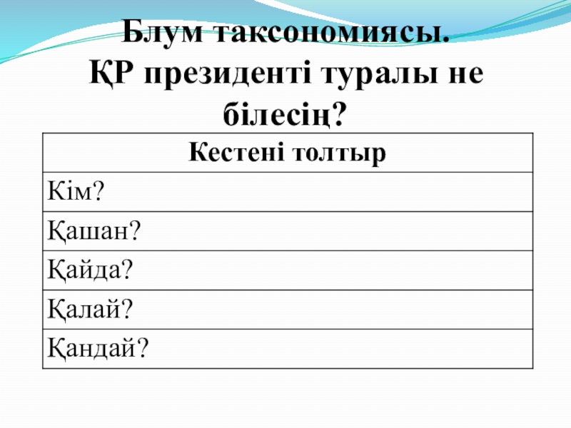 Слайд 3Блум таксономиясы. ҚР президенті туралы не білесің?