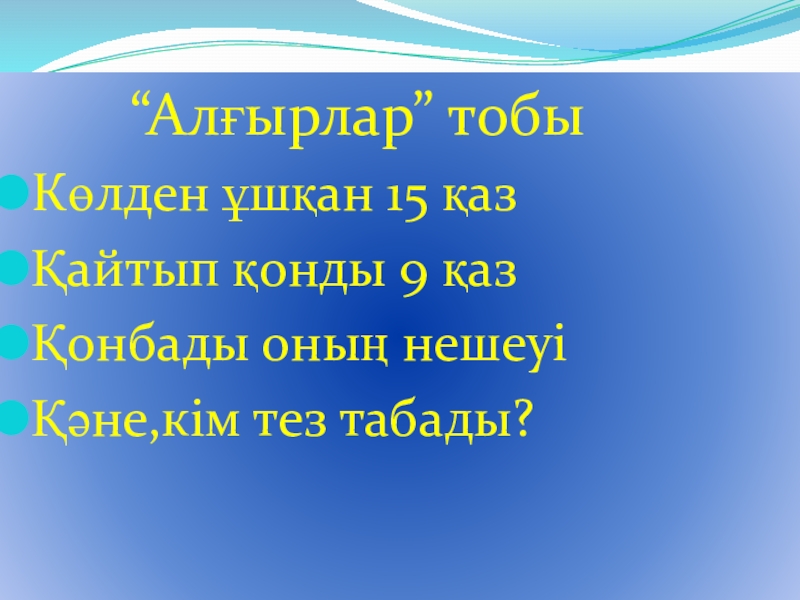 “Алғырлар” тобыКөлден ұшқан 15 қаз    Қайтып