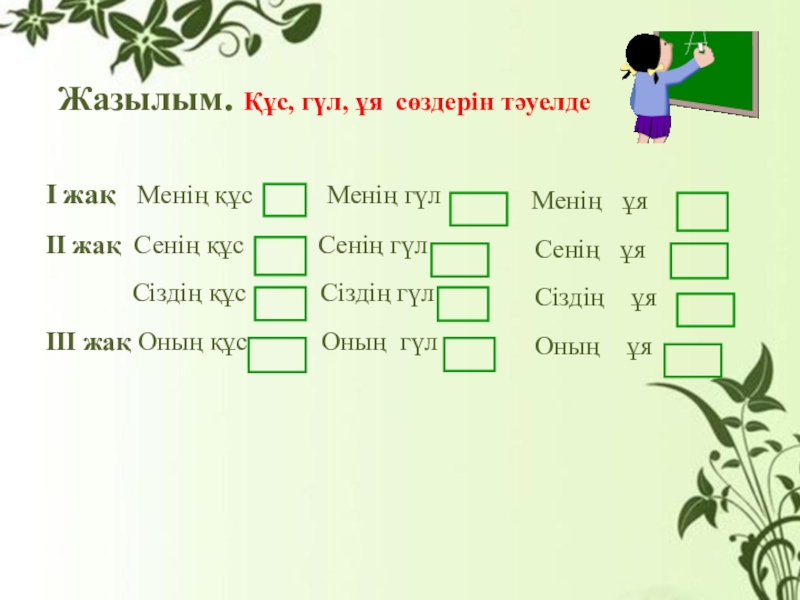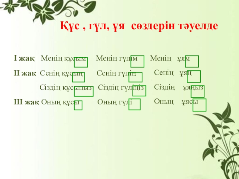 Жазылым. Құс, гүл, ұя сөздерін тәуелде