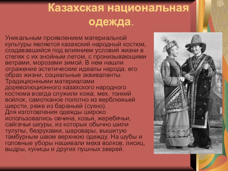 Уникальным проявлением материальной культуры является казахский народный костюм, создававшийся под влиянием условий жизни в степях с их знойным летом, с пронизывающими ветрами, морозами зимой. В нем нашли отражение эстетические идеалы народа, его образ жизни, социальные эквиваленты.