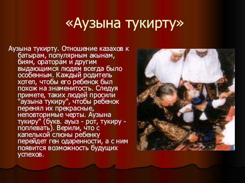 ораторам и другим выдающимся людям всегда было особенным. Каждый родитель хотел, чтобы его ребенок был похож на знаменитость. Следуя примете, таких людей просили "аузына тукиру", чтобы ребенок перенял их прекрасные, неповторимые черты. Аузына тукиру" (букв. ауыз - рот, тукиру - поплевать). Верили, что с капелькой слюны ребенку перейдет ген одаренности, а с ним появится возможность будущих успехов.