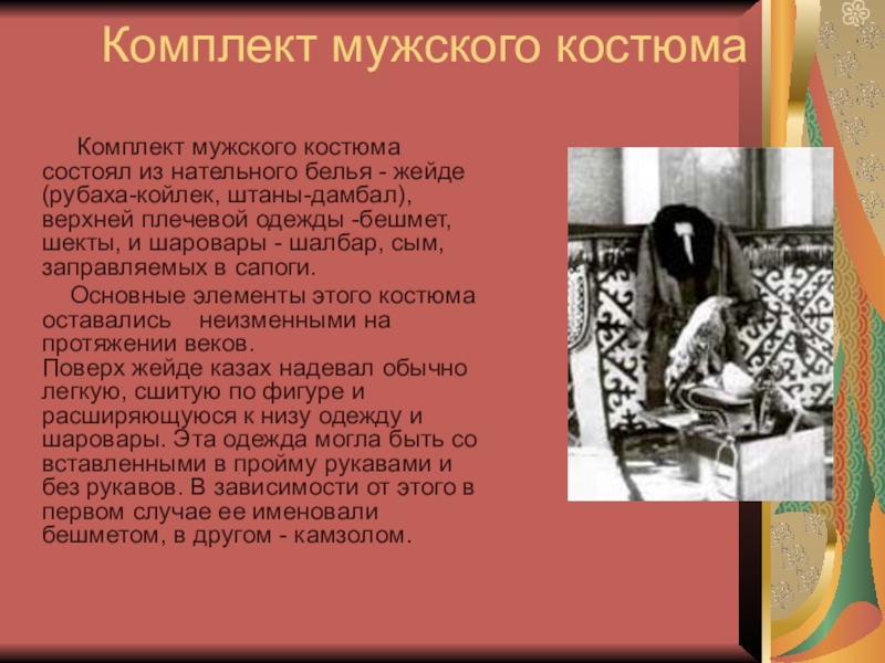 Поверх жейде казах надевал обычно легкую, сшитую по фигуре и расширяющуюся к низу одежду и шаровары. Эта одежда могла быть со вставленными в пройму рукавами и без рукавов. В зависимости от этого в первом случае ее именовали бешметом, в другом - камзолом.