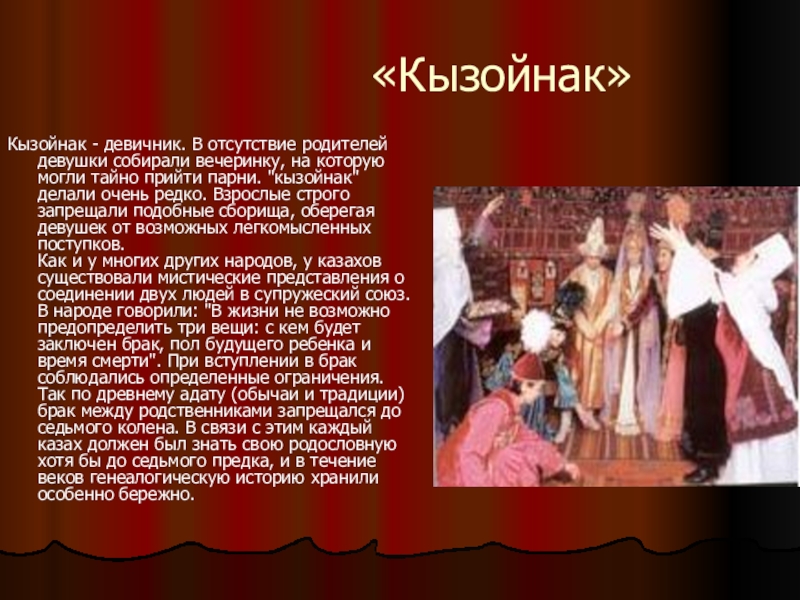 Как и у многих других народов, у казахов существовали мистические представления о соединении двух людей в супружеский союз. В народе говорили: "В жизни не возможно предопределить три вещи: с кем будет заключен брак, пол будущего ребенка и время смерти". При вступлении в брак соблюдались определенные ограничения. Так по древнему адату (обычаи и традиции) брак между родственниками запрещался до седьмого колена. В связи с этим каждый казах должен был знать свою родословную хотя бы до седьмого предка, и в течение веков генеалогическую историю хранили особенно бережно.