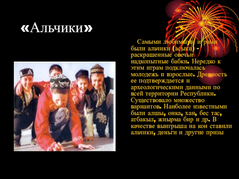 - раскрашенные овечьи надкопытные бабки. Нередко к этим играм подключалась молодежь и взрослые. Древность ее подтверждается и археологическими данными по всей территории Республики. Существовало множество вариантов. Наиболее известными были алшы, онка, хан, бес тас, атбакыл, жиырма бир и др. В качестве выигрыша на кон ставили альчики, деньги и другие призы