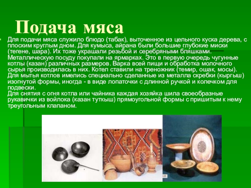 куска дерева, с плоским круглым дном. Для кумыса, айрана были большие глубокие миски (тегене, шара). Их тоже украшали резьбой и серебряными бляшками.