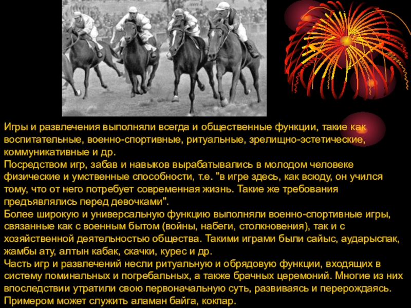 Часть игр и развлечений несли ритуальную и обрядовую функции, входящих в систему поминальных и погребальных, а также брачных церемоний. Многие из них впоследствии утратили свою первоначальную суть, развиваясь и перерождаясь. Примером может служить аламан байга, кокпар.