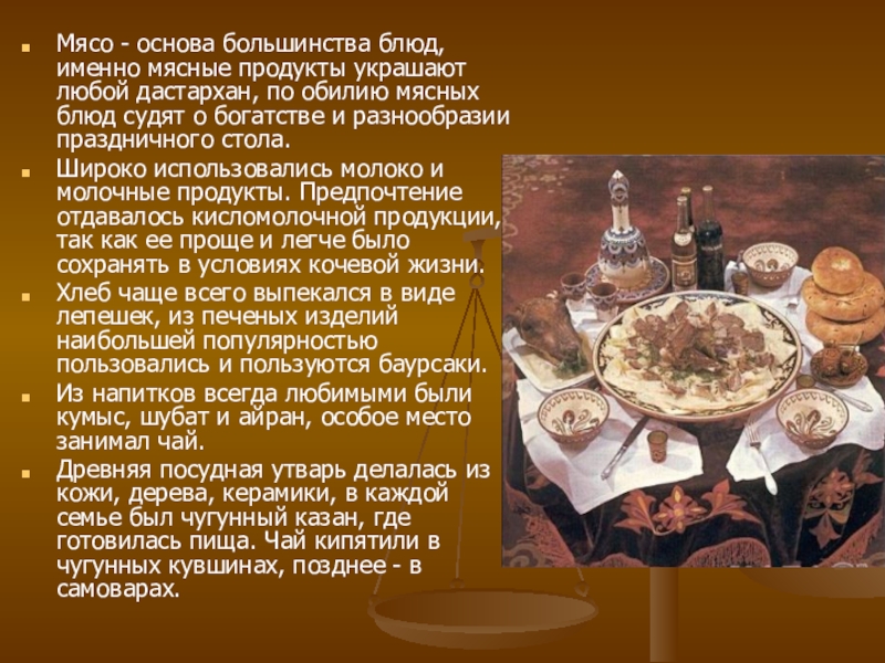 Слайд 25Мясо - основа большинства блюд, именно мясные продукты украшают любой дастархан,