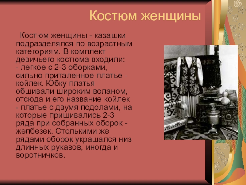 Костюм женщины - казашки подразделялся по возрастным категориям. В комплект девичьего костюма входили: