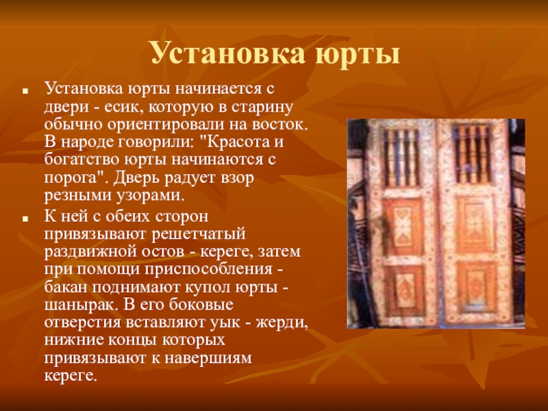 старину обычно ориентировали на восток. В народе говорили: "Красота и богатство юрты начинаются с порога". Дверь радует взор резными узорами.
