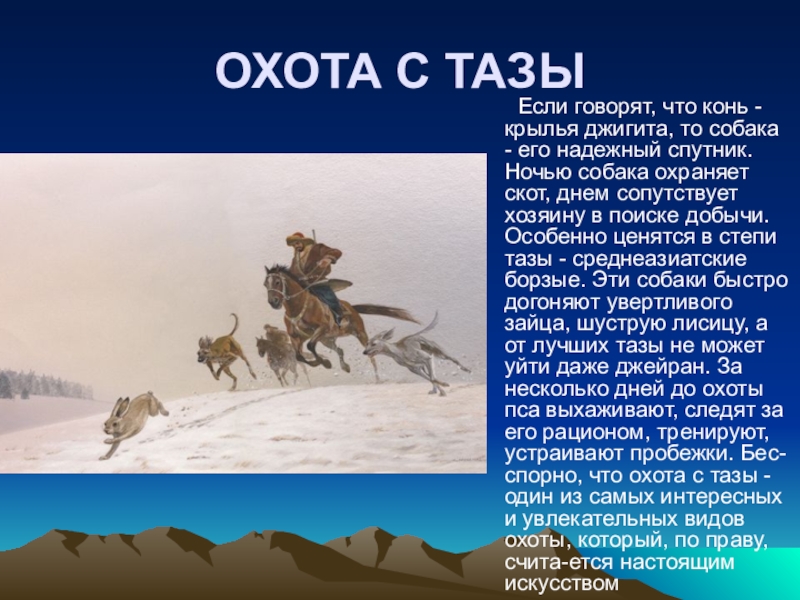 то собака - его надежный спутник. Ночью собака охраняет скот, днем сопутствует хозяину в поиске добычи. Особенно ценятся в степи тазы - среднеазиатские борзые. Эти собаки быстро догоняют увертливого зайца, шуструю лисицу, а от лучших тазы не может уйти даже джейран. За несколько дней до охоты пса выхаживают, следят за его рационом, тренируют, устраивают пробежки. Бес-спорно, что охота с тазы - один из самых интересных и увлекательных видов охоты, который, по праву, счита-ется настоящим искусством