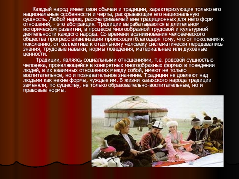 и традиции, характеризующие только его национальные особенности и черты, раскрывающие его национальную сущность. Любой народ, рассматриваемый вне традиционных для него форм отношений, - это абстракция. Традиции вырабатываются в длительном историческом развитии, в процессе многообразной трудовой и культурной деятельности каждого народа. Со времени возникновения человеческого общества прогресс цивилизации происходил благодаря тому, что от поколения к поколению, от коллектива к отдельному человеку систематически передавались знания, трудовые навыки, нормы поведения, материальные или духовные ценности.