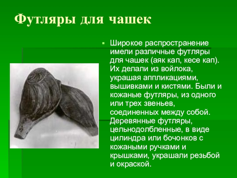 кап, кесе кап). Их делали из войлока, украшая аппликациями, вышивками и кистями. Были и кожаные футляры, из одного или трех звеньев, соединенных между собой.