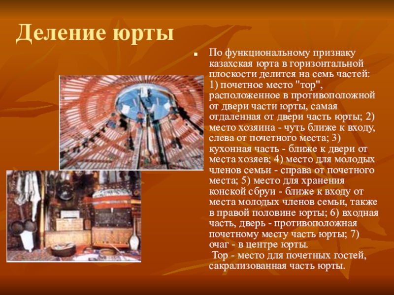 семь частей: 1) почетное место "тор", расположенное в противоположной от двери части юрты, самая отдаленная от двери часть юрты; 2) место хозяина - чуть ближе к входу, слева от почетного места; 3) кухонная часть - ближе к двери от места хозяев; 4) место для молодых членов семьи - справа от почетного места; 5) место для хранения конской сбруи - ближе к входу от места молодых членов семьи, также в правой половине юрты; 6) входная часть, дверь - противоположная почетному месту часть юрты; 7) очаг - в центре юрты.